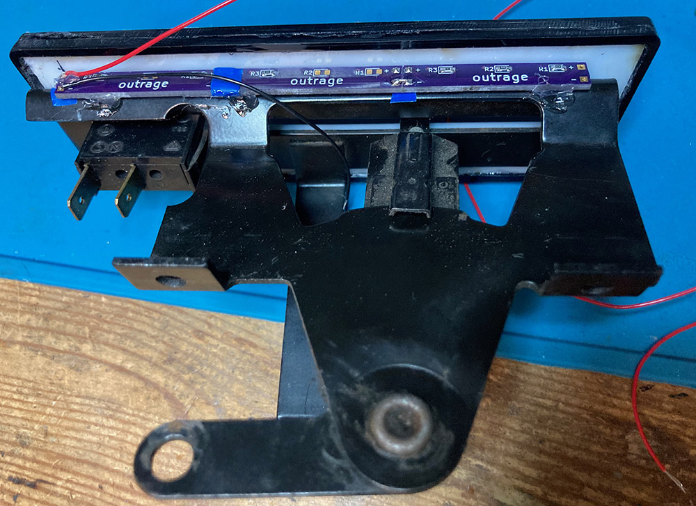 Ich habe einfach mal über die gesamte Breite Platz für LEDs vorgesehen und dann nur an den Stellen bestückt, wo auf der Blende ein Wort steht (Mist schon wieder kein Bild von der LED-Seite. Ich muss mal drauf achten, mehr zu fotografieren).