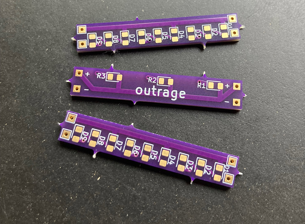 Dann habe ich mir eine Platine ausgedacht. Erst wollte ich sie über die ganze Breite machen. Aber da man bei Oshpark immer drei Platinen bekommt, habe ich sie gedrittelt.